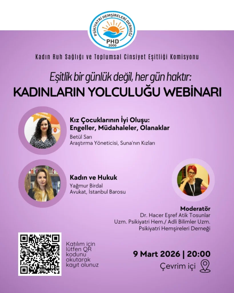 📣 Psikiyatri Hemşireleri Derneği Kadın Ruh Sağlığı ve Toplumsal Cinsiyet Eşitliği Komisyonu tarafından düzenlenen “Kadınların Yolculuğu” Webinarı 9 Mart 2026 tarihinde saat 20:00’de çevrim içi yapılacak!