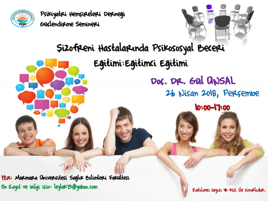 Psikiyatri Hemşireleri Güçlendirme Seminerleri kapsamında Doç. Dr. Gül Ünsal’ın eğitimini verdiği Şizofreni Hastalarında Psikososyal Beceri Eğitimi: Eğitimci Eğitimi, 26 Nisan 2018, Perşembe günü saat 10:00-17:00 arasında Marmara Üniversitesi Sağlık Bilimleri Fakültesinde gerçekleştirilecektir.
